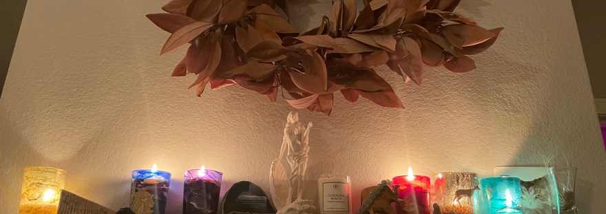 Once the sun has set, I go through my apartment and light each candle one by one, and check in with the deity of that candle. I like to thank the deity for their blessings and their presence in my life, and check in with Them about the past year. For the ones I work with less frequently, it’s like catching up with an old friend and it seems like no time has passed. For those I work with more often, it’s a comfortable chat and a reassuring reminder of Their presence in my life. If there are big things that the deity helped me with this past year, I make sure to honor those. And if I would like their support for a specific goal or intention for the new year, I share that with Them, too.